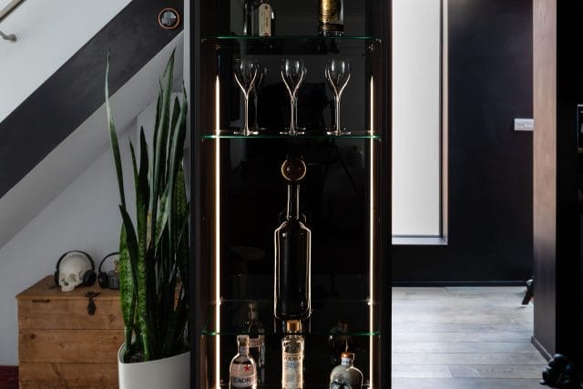 This remarkable kitchen is far from style over substance. Cutting-edge VZUG appliances and a Quooker tap provide outstanding performance. The classic, U-shaped layout promotes a seamless workflow. A bank of tall cabinets housing state-of-the-art refrigeration, a bespoke display unit, and a custom wine rack add to the kitchen’s functional capabilities. Thanks to the black finish’s ability to blend the cabinetry into the background, we incorporated ample storage with a run of overhead wall units. Integrated plug sockets also deliver both practicality and style, maintaining the pristine, minimalist finish.