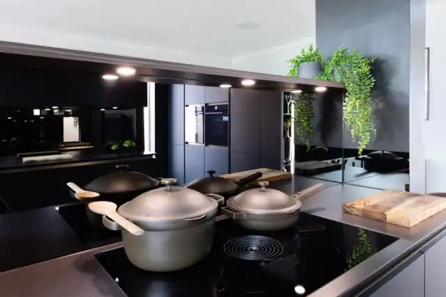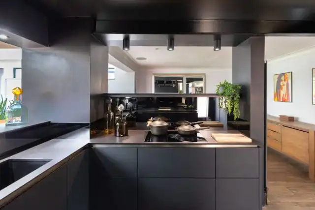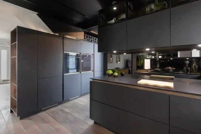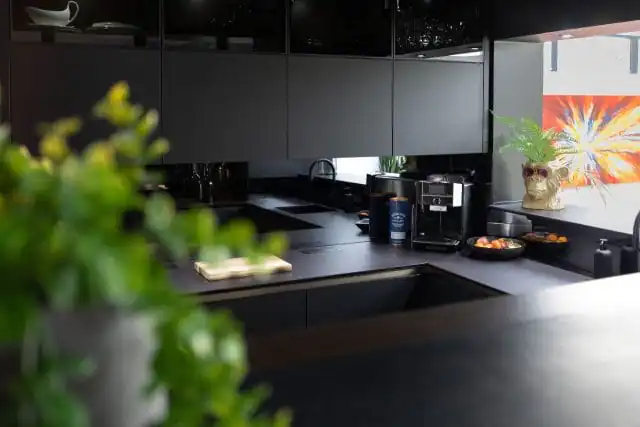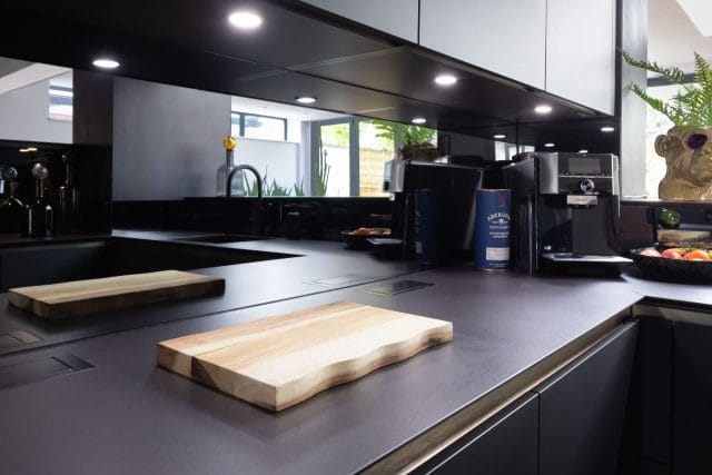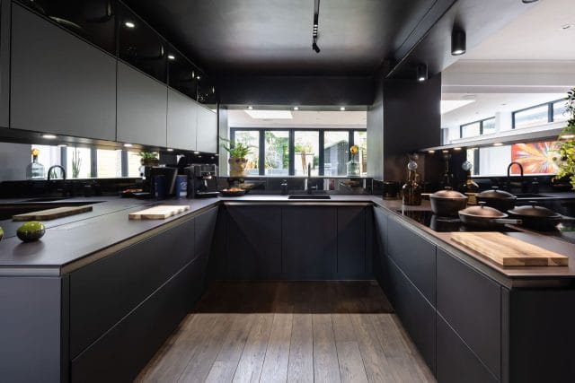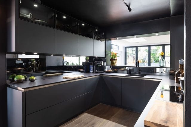 For what it lacks in scale, this spectacular kitchen definitely makes up for in terms of drama and style. This showstopping all-black kitchen delivers impressive performance and undeniably extraordinary looks. And if you were ever worried about a dark colour scheme making your space look small, this interior goes to show that simply isn’t the case. The floor-to-ceiling black finishes blur the boundaries of the room, establishing a sense of endless space and depth. The mirror finish splashbacks enhance this effect, creating a clever optical illusion.