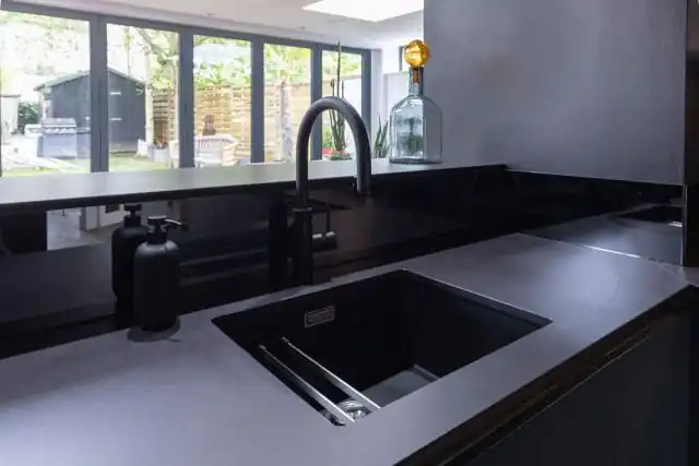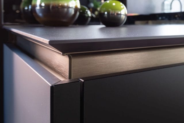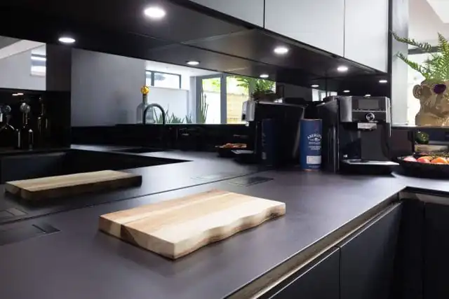 PRONORM X-LINE MATT LACQUER BLACK WITH DEKTON DOMOOS SHARK NOSE WORKTOPS