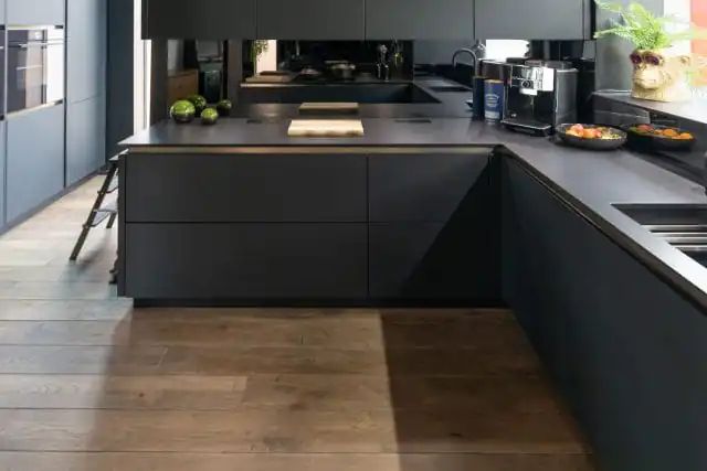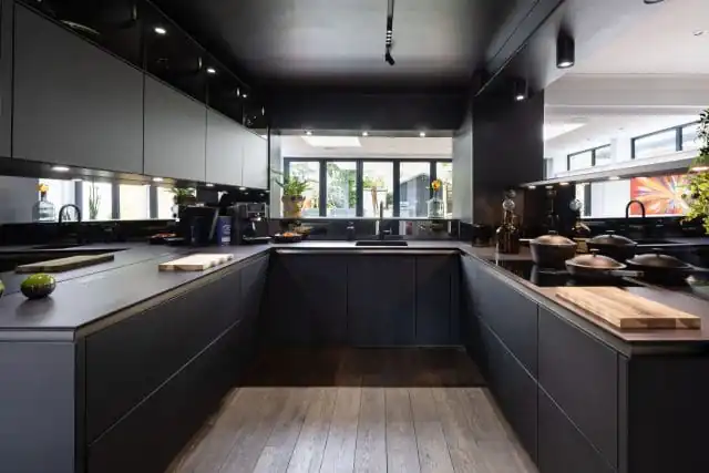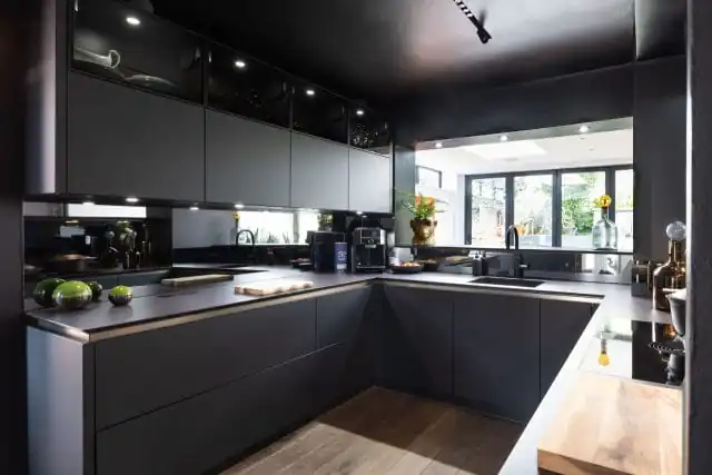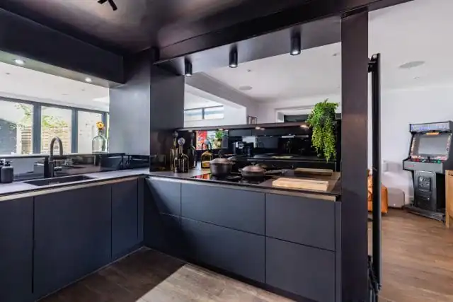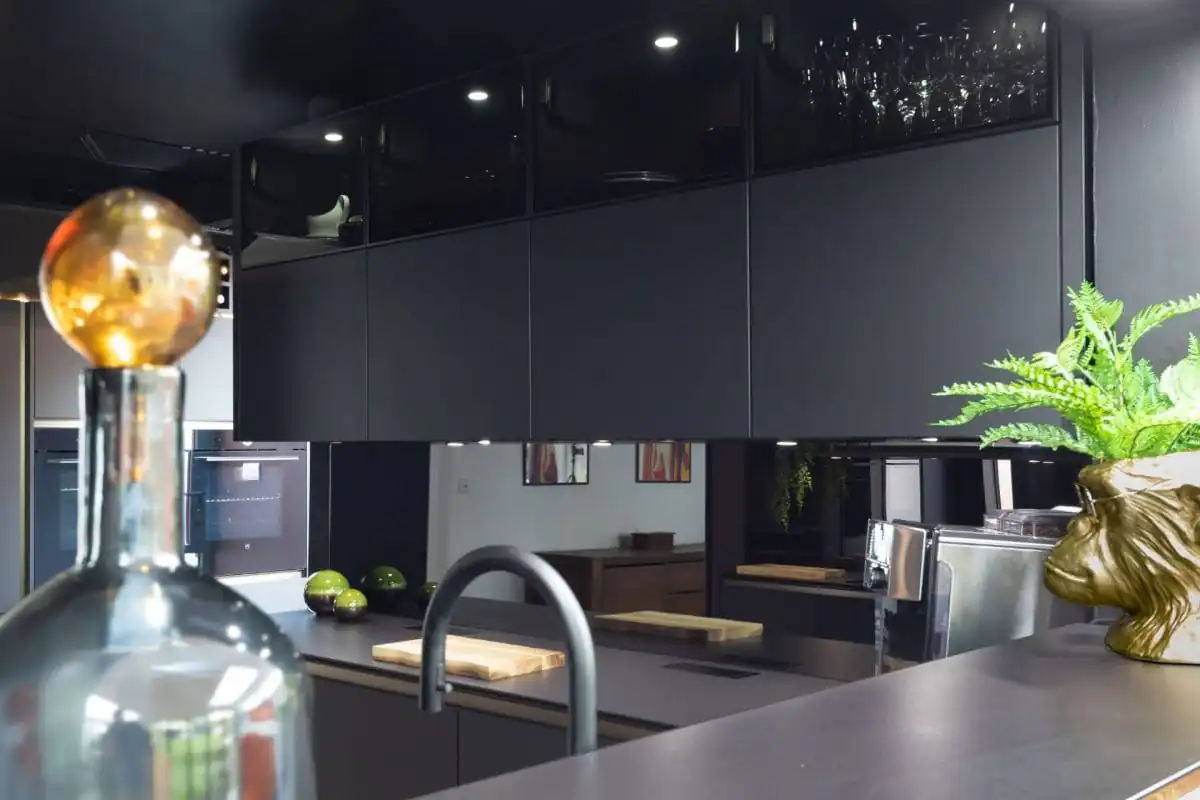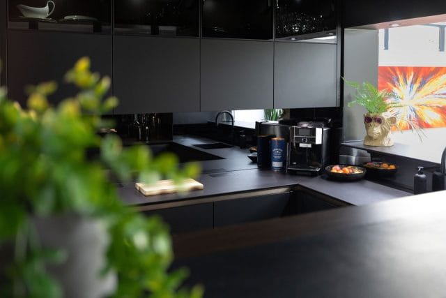 A combination of natural light, ceiling spots, and integrated cabinet lighting adds a sumptuous glow to the scheme, preventing the kitchen from looking dull and providing excellent visibility. Our client’s luxurious walnut flooring and stylish accessories punctuate the all-black look beautifully. The natural wood accents and brushed brass grip rails soften the crisp black surfaces, while the verdant houseplants and green vases add a fantastic pop of colour and vitality. These simple details elevate the design, introducing a chic and opulent edge.