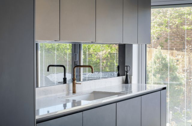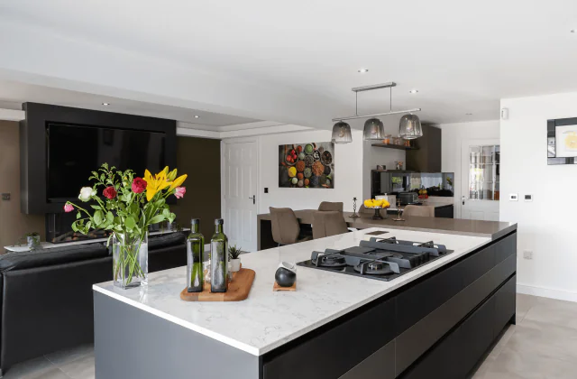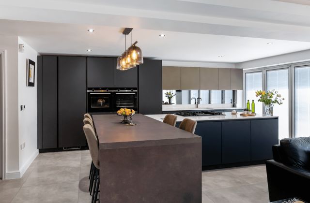 The exquisite Matt Black cabinetry dominating this kitchen sets a moody and sophisticated tone to the room. Paired with a pristine handleless design, the soft texture feels sumptuous and chic. A sleek row of Steelbrush Gold overhead cabinets adds to the luxurious tone, as does the stylish ceiling light. Contrasting Silestone White Arabesque worktops prevent the scheme from becoming too dark. The mirrored splashback completes the look, introducing a glamorous metallic flourish.